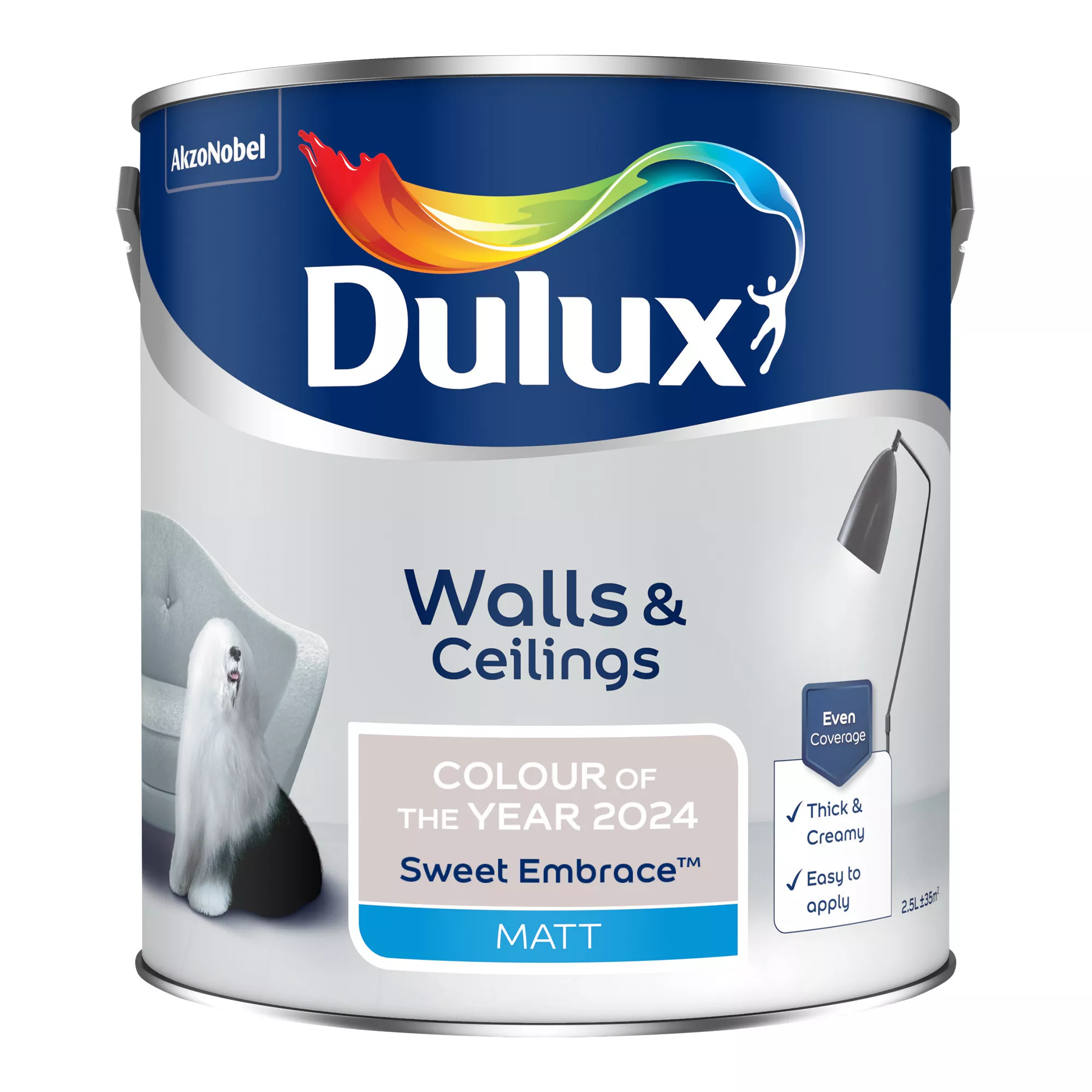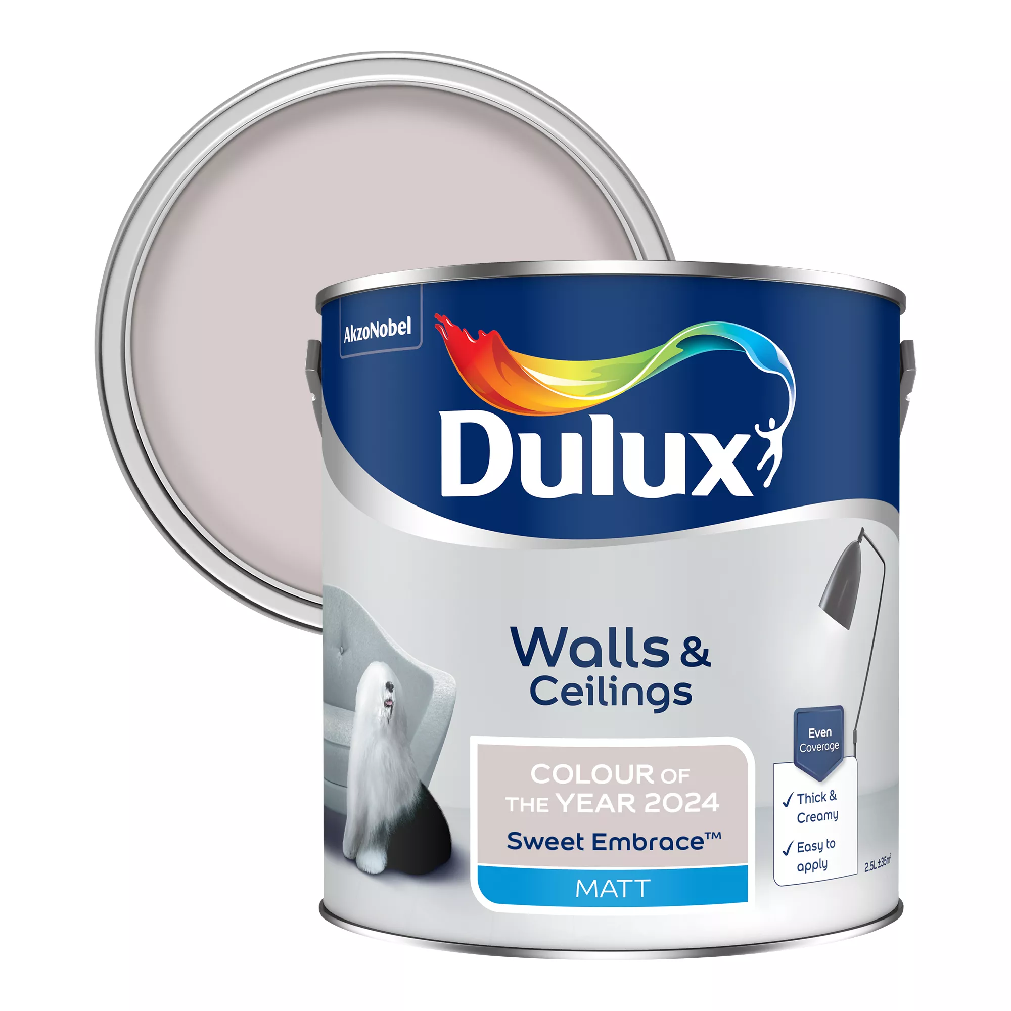 Dulux Colour of the Year 2024, Sweet Embrace™, is a kind, delicate tone that brings a feeling of positivity to our lives. Dulux Matt is a smooth and creamy emulsion paint, suitable for use on the walls and ceilings and ideal for a modern, flat finish.